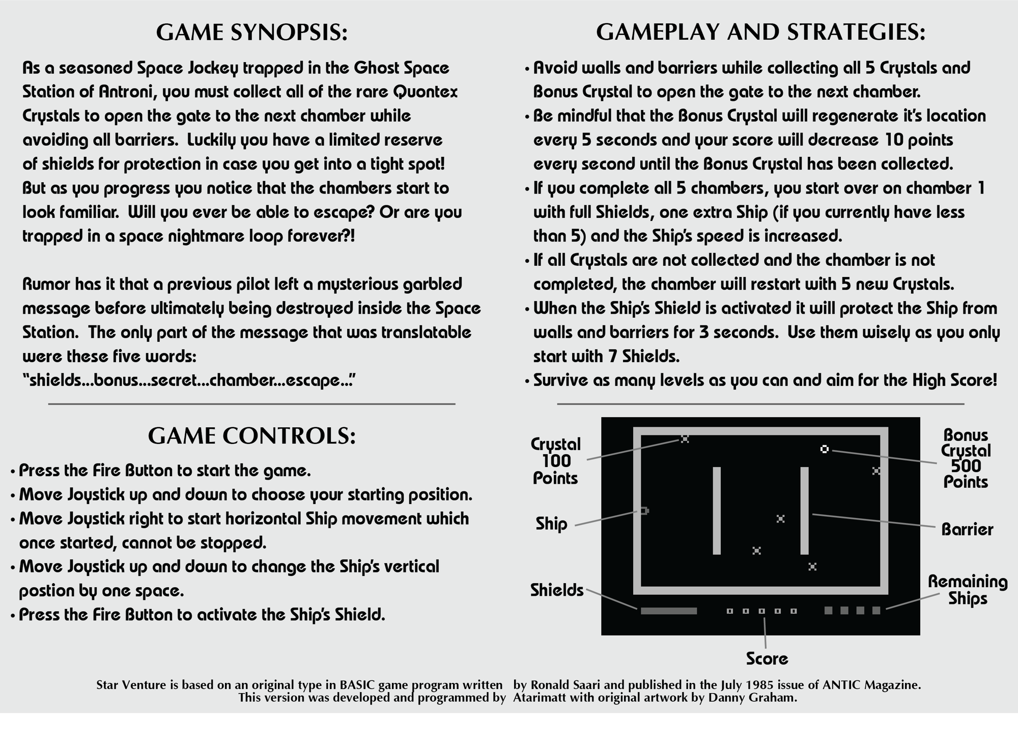 Star Venture is a 2600 adaptation of a fast paced addictive game originally written by Ronald Saari as an Atari Computer BASIC type in game from the July 1985 edition of Antic Magazine.
